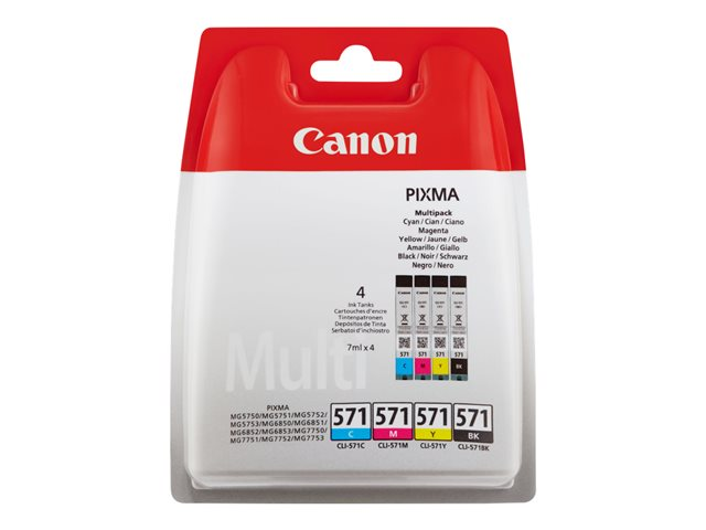 Canon CLI-571 C/M/Y/BK Multipack - Pack de 4 - 7 ml - noir, jaune, cyan, magenta - original - coque avec sécurité - réservoir d'encre - pour PIXMA TS5051, TS5053, TS5055, TS6050, TS6051, TS6052, TS8051, TS8052, TS9050, TS9055