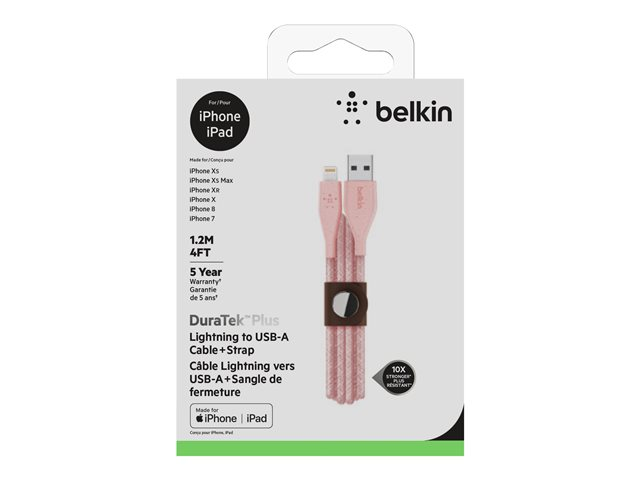 DuraTek, la technologie avancée de durabilité, permet de renforcer votre câble, à l'intérieur comme à l'extérieur, afin d'offrir un câble Belkin extrêmement robuste. Grâce à son design élégant, le câble s'intègre à tout environnement. La sangle permet quant à elle d'enrouler le câble et d'éviter les enchevêtrements.
